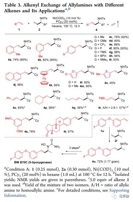 然后,作者研究了烯烴的底物范圍(Table 3)。含有不種電性和空間位阻取代基的芳基烯烴以及雜芳基烯烴大多以較好的產(chǎn)率(60%~98%)順利進(jìn)行反應(yīng),僅噻吩基取代的烯烴4n得到的產(chǎn)率較低(45%)。TMS和Bpin基團(tuán)對(duì)該反應(yīng)耐受性良好,易于進(jìn)一步官能團(tuán)化。脂肪族α-烯烴也可以與2a反應(yīng),但主產(chǎn)物為高烯丙基胺;僅有底物1f的主產(chǎn)物是烯丙基胺4r。這種轉(zhuǎn)化可用于復(fù)雜分子的衍生化:利用烯丙胺2i與烯烴1u反應(yīng)作為關(guān)鍵步驟,成功合成了5-脂氧合酶抑制劑BW B70C。
