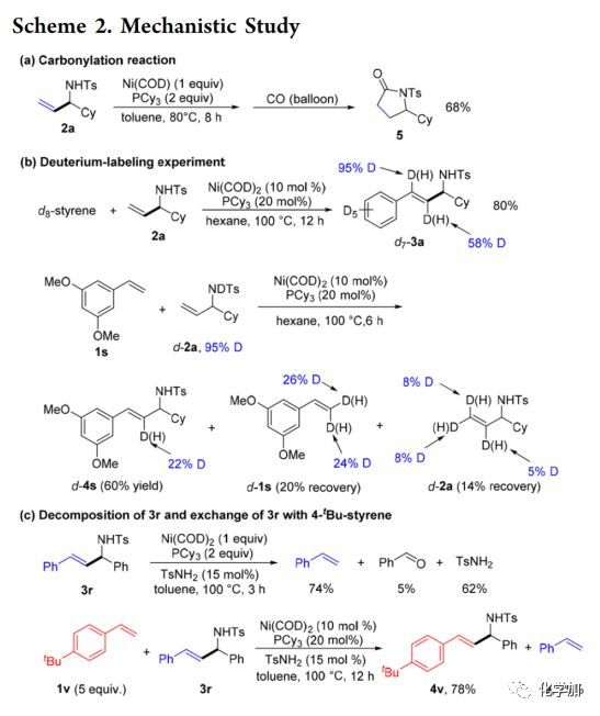 Ogoshi課題組和作者均報(bào)道,Ni(0)可以介導(dǎo)亞胺和烯烴的反應(yīng)形成五元氮雜-鎳金屬環(huán)中間體。作者在此主要研究氮雜-鎳金屬環(huán)形成的各個(gè)步驟和烯丙胺的C-C鍵斷裂(Scheme 2)。首先,作者發(fā)現(xiàn)在化學(xué)計(jì)量的Ni(COD)2/PCy3作用下,烯丙胺2a與CO發(fā)生羰基化得到γ-內(nèi)酰胺5(Scheme 2a)。CO插入Ni-C鍵中,表明Ni(0)與烯丙胺2a形成氮雜-鎳金屬環(huán)中間體。接下來,作者用d8-苯乙烯和d-2a進(jìn)行了氘標(biāo)記實(shí)驗(yàn)(Scheme 2b),產(chǎn)物和回收底物中C=C鍵處的不規(guī)則H/D分布表明:1)2a的N-H質(zhì)子參與Ni-H中間體的形成;2)Ni-H的形成和隨后的插入/環(huán)化/β-H消除都是可逆的。為了評(píng)估C-C鍵的裂解步驟(Scheme 2c),作者研究了烯丙胺3r的裂解反應(yīng)并得到苯乙烯和苯甲醛。該結(jié)果表明,烯丙胺可以被Ni催化劑裂解成亞胺和烯烴,再與另一種烯烴進(jìn)行交換。烯丙胺3r與4-叔丁基苯乙烯的交換反應(yīng)僅產(chǎn)生烯丙胺4v而未產(chǎn)生1-苯基-2-(4-叔丁基苯基)乙烯,表明該反應(yīng)通過可逆烯基交換機(jī)理進(jìn)行,而非烯烴復(fù)分解機(jī)理