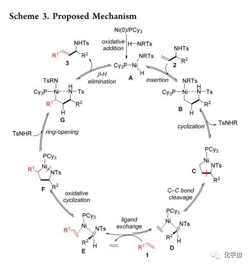 基于先前的研究和上述實(shí)驗(yàn)結(jié)果,作者提出了烯丙胺的烯基交換的可能反應(yīng)機(jī)理(Scheme 3)。1)芳胺的N-H鍵與Ni(0)氧化加成得到Ni-H中間體A;2)2中C=C鍵插入Ni-H鍵中,然后進(jìn)行分子內(nèi)配位/環(huán)化得到氮雜-鎳金屬環(huán)中間體C;3)C經(jīng)C-C鍵裂解形成由烯烴和亞胺配位的鎳絡(luò)合物D;4)中間體D與烯烴1進(jìn)行配體交換產(chǎn)生中間體E,E再經(jīng)新的氧化環(huán)化形成氮雜-鎳金屬環(huán)中間體F。芳胺的N-H鍵通過N原子質(zhì)子化促進(jìn)F的開環(huán)形成中間體G并與氮雜-鎳金屬環(huán)的鎳原子配位。最后,G經(jīng)β-H消除產(chǎn)生鏈烯基交換產(chǎn)物3,并再生Ni-H中間體A。
