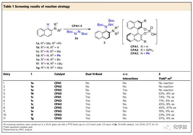 手性磷酸可同時(shí)活化含弱酸性氫原子的2-萘胺和偶氮二羧酸酯生成雙重氫鍵中間體A,從而構(gòu)建手性N-C軸(Fig. 2a)。因此,作者使用N-取代2-萘胺1和偶氮二甲酸二叔丁酯(DBAD)2a作為模板底物,并對(duì)反應(yīng)進(jìn)行了篩選(Table 1)。作者發(fā)現(xiàn)N-Me,Ph二取代的2-萘胺1a不能得到相應(yīng)產(chǎn)物,而具有N-H鍵的偶氮二羧酸酯1b和1c則能順利得到相應(yīng)的胺化產(chǎn)物。這些結(jié)果表明N-H鍵對(duì)該反應(yīng)起著至關(guān)重要的作用。但即使使用位阻較大的Ph-或Ph3Si-取代的手性磷酸,該反應(yīng)的對(duì)映選擇性均較低。理論上,通過增大2-萘胺C8位取代基的空間位阻是可以提高產(chǎn)物的對(duì)映選擇性得,但這會(huì)極大地限制該反應(yīng)的底物范圍。