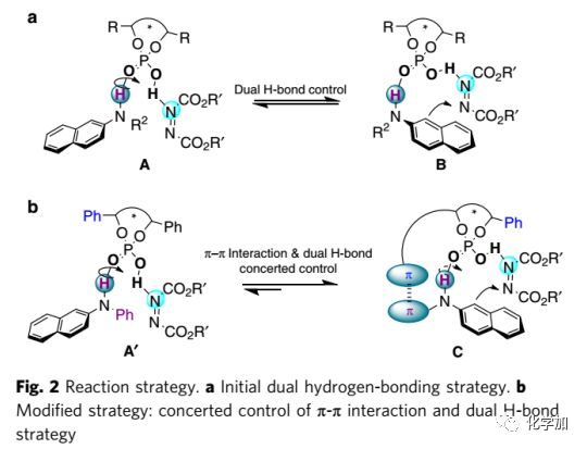 根據(jù)實(shí)驗(yàn)結(jié)果以及前人的報(bào)道,作者推測可能的機(jī)理(Fig. 3):首先,CPA通過雙重氫鍵活化模式同時(shí)活化N-苯基-2-萘胺和偶氮二羧酸酯生成中間體I。然后,在π-π相互作用下,N-苯基-2-萘胺與偶氮二羧酸酯發(fā)生親核加成反應(yīng)生成中間體II。II重新芳構(gòu)化生成胺化產(chǎn)物3a。