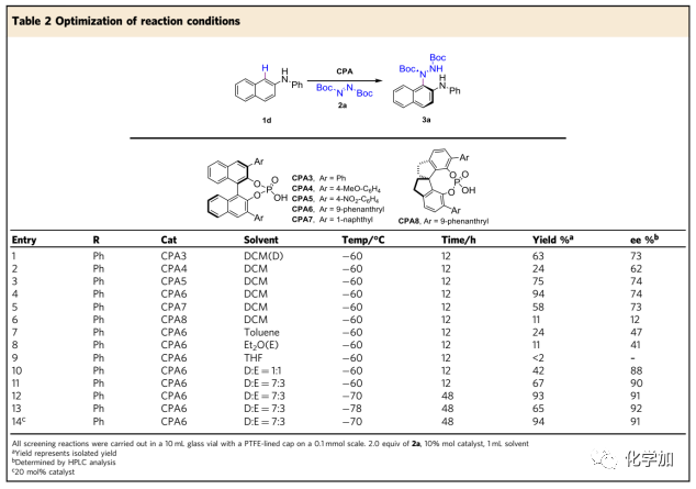 確定N-苯基-2-萘胺1d和DBAD 2a為模板底物后,作者通過對(duì)催化劑、溶劑、溫度等反應(yīng)條件進(jìn)行篩選,確定最優(yōu)的反應(yīng)條件(Table 2):10 mol% CPA6為催化劑,DCM:Et2O = 7:3為溶劑,在-70 ℃條件下反應(yīng)48 h,能以93%的收率和91%的對(duì)映選擇性得到相應(yīng)產(chǎn)物。