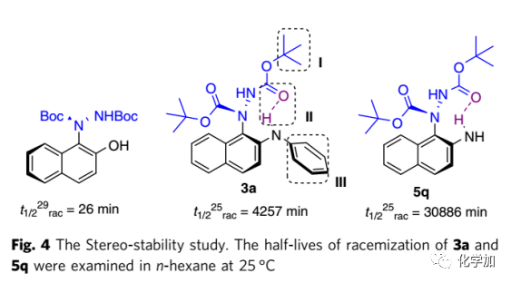 接下來,作者考察了偶氮二羧酸酯取代基空間位阻、分子內(nèi)氫鍵以及萘胺取代基對(duì)N-C軸手性化合物的立體穩(wěn)定性的影響(Fig. 4)。為了確認(rèn)產(chǎn)物的低對(duì)映選擇性是因?yàn)榉磻?yīng)過程中易發(fā)生外消旋化還是立體選擇性較難控制,作者做了三個(gè)平行實(shí)驗(yàn):在標(biāo)準(zhǔn)條件下,作者分別在反應(yīng)12小時(shí)、24小時(shí)和48小時(shí)后測定3d的對(duì)映選擇性,發(fā)現(xiàn)測定結(jié)果相差不大。這說明N-C軸手性化合物在標(biāo)準(zhǔn)條件下很穩(wěn)定,不會(huì)發(fā)生外消旋化。其次,作者比較了70.9 h后3a的對(duì)映選擇性(92%ee)和25.0 h后3d的對(duì)映選擇性(67%ee),該結(jié)果表明偶氮二羧酸酯的取代基的空間位阻越大,其產(chǎn)物的穩(wěn)定性越高。其次,作者還測定了易形成分子內(nèi)氫鍵的化合物5q(手性拆分獲得)的半衰期為514.8 h,這說明分子內(nèi)氫鍵可以顯著提高N-C軸手性化合物的立體穩(wěn)定性。