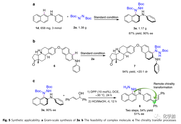 為了證明該反應(yīng)的應(yīng)用潛力,作者進(jìn)行了克級(jí)規(guī)模反應(yīng)(Fig. 5),也能以87%的收率和90%的對(duì)映選擇性得到相應(yīng)產(chǎn)物。緊接著,作者證明了該策略在復(fù)雜分子的后期修飾中的可行性。標(biāo)準(zhǔn)條件下,雌酮衍生物6具有良好的耐受性,能以優(yōu)秀的收率、對(duì)映選擇性以及非對(duì)映選擇性得到產(chǎn)物7。此外,磷酸二苯酯可催化N-C軸手性胺化產(chǎn)物3a與(E)-1,3-二苯基丙-2-烯-1-醇在-30 ℃條件下的DCE溶劑中反應(yīng)24 h,能以72%的收率得到相應(yīng)產(chǎn)物。該產(chǎn)物在HCl/MeOH中脫掉Boc基團(tuán)后可實(shí)現(xiàn)C1-到C8位遠(yuǎn)程手性轉(zhuǎn)換。