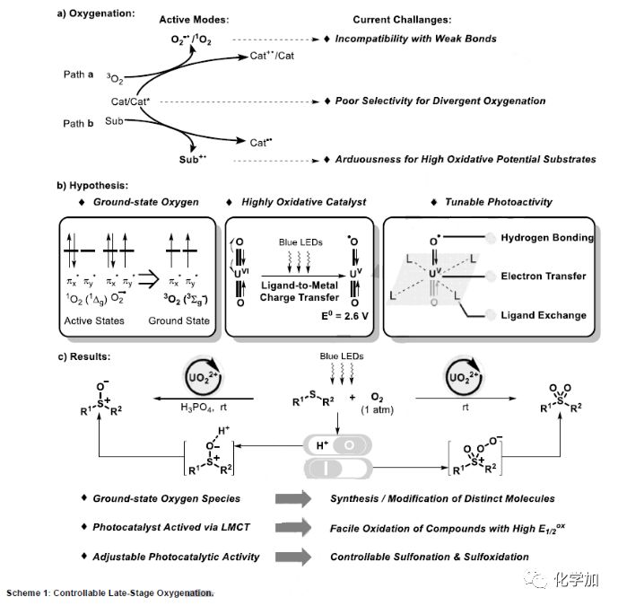 近日,華東師范大學姜雪峰教授課題組報道了鈾酰基陽離子光催化基態(tài)氧參與的硫化物選擇性后期氧化反應(yīng)(Scheme 1c)。該方法通過機理研究闡述了基態(tài)氧在光催化反應(yīng)中的關(guān)鍵作用,對比了與傳統(tǒng)光催化劑的不同之處,并完成了一系列復雜藥物合成及精準修飾。