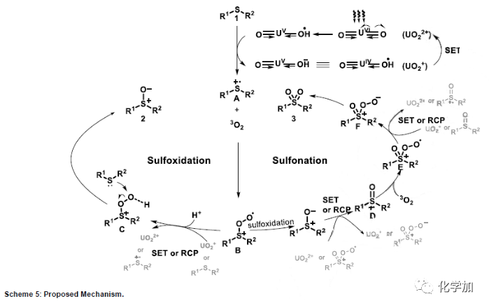 除了全面考察了該策略的應(yīng)用價值,作者還進行了詳盡的機理研究,并提出了如下可能的機理(Scheme 5)。首先,鈾?;栯x子吸收可見光,電子從O2p軌道轉(zhuǎn)移至U5f軌道(LMCT),并激發(fā)HOMO軌道的電子到非成鍵軌道生成*UO22+。然后,硫化物1與*UO22+發(fā)生電子傳遞,產(chǎn)生UO2+和硫化物自由基陽離子中間體A。隨后A和基態(tài)氧的反應(yīng)釋放出過氧亞砜自由基B。接著,UO2+將一個電子給B,再生鈾催化劑,生成過氧亞砜C,C與另一分子硫化物發(fā)生歸中反應(yīng)得到亞砜2。亞砜經(jīng)過第二輪單電子轉(zhuǎn)移(SET)產(chǎn)生D,捕獲基態(tài)氧并釋放過氧砜自由基E。隨后經(jīng)過過砜F,最終生成砜3。根據(jù)量子產(chǎn)率實驗,在兩個氧化過程中都發(fā)生了自由基鏈傳遞過程。此外,作者也不能排除Bakac教授等人提出的催化劑再生過程的存在(Scheme 5)。