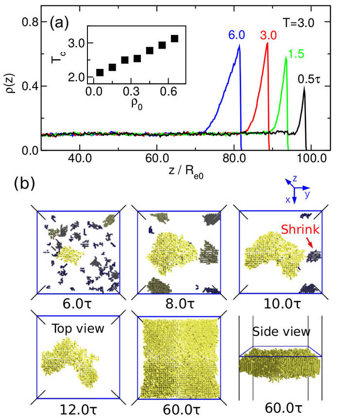圖1顯示在快速蒸發(fā)過程中隨著界面向左退縮的高分子濃度分布及其界面結(jié)晶形貌??梢钥吹礁叻肿釉谧杂杀砻嫣幮纬筛邼舛缺砥?。對(duì)于結(jié)晶高分子而言,其在溶液中的結(jié)晶能力與高濃度直接正相關(guān):圖1(a)中的插圖顯示隨著單體體積濃度從0.05增加到0.65,結(jié)晶約化溫度從2.0增加到3.1。因此在特定溫度(例如3.0)下,本體濃度為0.1的溶液無法結(jié)晶,但是當(dāng)快速蒸發(fā)形成的表皮層濃度高達(dá)0.65時(shí),仍然可以結(jié)晶,且只會(huì)限制在二維表皮層。圖1(b)顯示高分子晶核在快速蒸發(fā)過程中,其中小部分特定取向的晶核獲得持續(xù)的生長(zhǎng),而其它晶核則逐漸消失,顯示出典型的Ostwald熟化過程。最終結(jié)晶時(shí)刻t=60.0τ晶核生長(zhǎng)成二維高分子單晶。