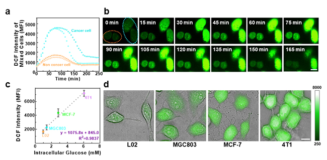 圖2. 肝癌細(xì)胞和正常肝細(xì)胞的熒光強(qiáng)度變化圖(a)以及對(duì)應(yīng)的共聚焦系統(tǒng)圖像(b);(c)不同細(xì)胞胞內(nèi)葡萄糖濃度和檢測(cè)熒光強(qiáng)度的關(guān)系;各細(xì)胞熒光強(qiáng)度達(dá)到峰值時(shí)的細(xì)胞圖像(d)。