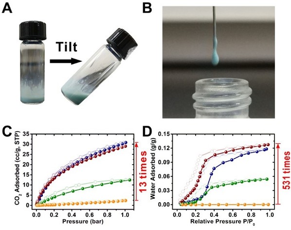 圖2. (A)(B)多孔液體的照片;(C)(D)分別為多孔液體儲(chǔ)存三個(gè)月后在273K下二氧化碳的吸附等溫線和298K下水蒸氣的吸附等溫線。相比于純PDMS溶劑,多孔液體二氧化碳和水蒸氣的吸附量分別提高了13倍和531倍。