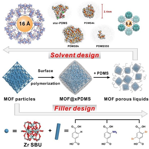 該工作選擇了PDMS作為位阻型溶劑,這是由于PDMS能夠在極高(~10kDa)的分子量下仍然保留液體的流動(dòng)性,這一性質(zhì)能夠確保PDMS不會(huì)進(jìn)入MOFs孔道使其多孔性得以保留。PDMS還具有優(yōu)異的化學(xué)和熱穩(wěn)定性、極低的蒸氣壓、高熱穩(wěn)定性、低熔點(diǎn)、低比熱容、低粘度、低成本、無(wú)毒、極高的氣體擴(kuò)散系數(shù)和無(wú)腐蝕性等特點(diǎn)。這些特質(zhì)使得PDMS成為一個(gè)理想的多孔液體溶劑,將MOFs顆粒分散于PDMS溶劑中能在保留MOFs多孔特性的同時(shí)使其附有類似液體吸附劑的流動(dòng)性。然而,由于MOFs材料表面性質(zhì)和PDMS不兼容,如何形成穩(wěn)定分散液是一個(gè)難題。對(duì)此,李濤課題組的博士研究生何三豐利用之前課題組開(kāi)發(fā)的一種具有普適性的MOFs表面生長(zhǎng)高分子的策略(He et al. Chem. Sci. 2019, 10, 1816-1822),將帶有PDMS支鏈的超薄高分子涂層均勻生長(zhǎng)在MOFs顆粒表面。這一表面修飾步驟確保了MOFs顆粒與PDMS溶劑之間的相容性,使該膠體懸浮液(colloidal suspension)的分散穩(wěn)定性大大提升。