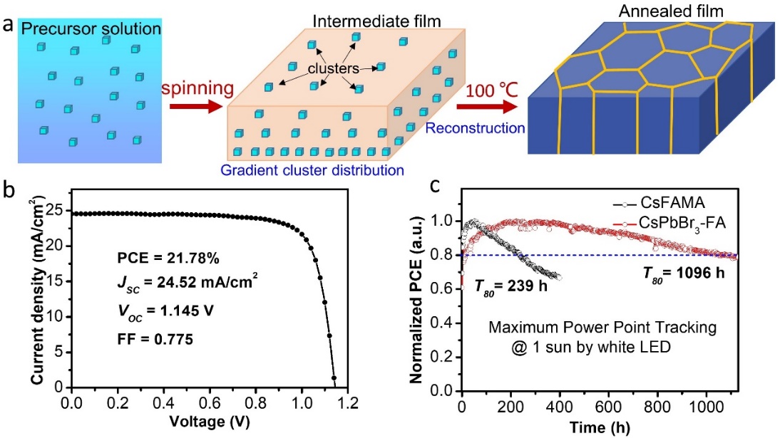 本次研究成果報道了一種基于CsPbBr3簇誘導(dǎo)的、自下而上的鈣鈦礦結(jié)晶方式,能夠制備出具有純α相、高質(zhì)量、低缺陷濃度、無甲胺陽離子的鈣鈦礦膜。研究者發(fā)現(xiàn)預(yù)合成的CsPbBr3粉末能在鈣鈦礦前驅(qū)液中形成納米尺度的團簇,這些團簇在鈣鈦礦中間體的形成過程中能作為晶種輔助鈣鈦礦膜的生長,并在后續(xù)的退火處理中被除去(圖a)。采用這種制備方法,僅需使用1%-6%的CsPbBr3就能實現(xiàn)高質(zhì)量、無甲胺陽離子鈣鈦礦的制備,從而使得這種鈣鈦礦太陽能電池的短路電流密度達到24.52 mA/cm2,光電轉(zhuǎn)換效率達到21.78%(圖b)。更重要的是,優(yōu)化后的鈣鈦礦電池能在工作狀況下(100 mW/cm2光照、最大功率點跟蹤)測試1000小時后,保持82%的初始效率(圖c)。本研究提出了一種新的通過調(diào)控鈣鈦礦前驅(qū)液化學(xué)組成來制備高效率、高穩(wěn)定性鈣鈦礦電池的方法,后續(xù)有望通過優(yōu)化鈣鈦礦/電荷傳輸層界面,進一步提高鈣鈦礦電池的效率和穩(wěn)定性。