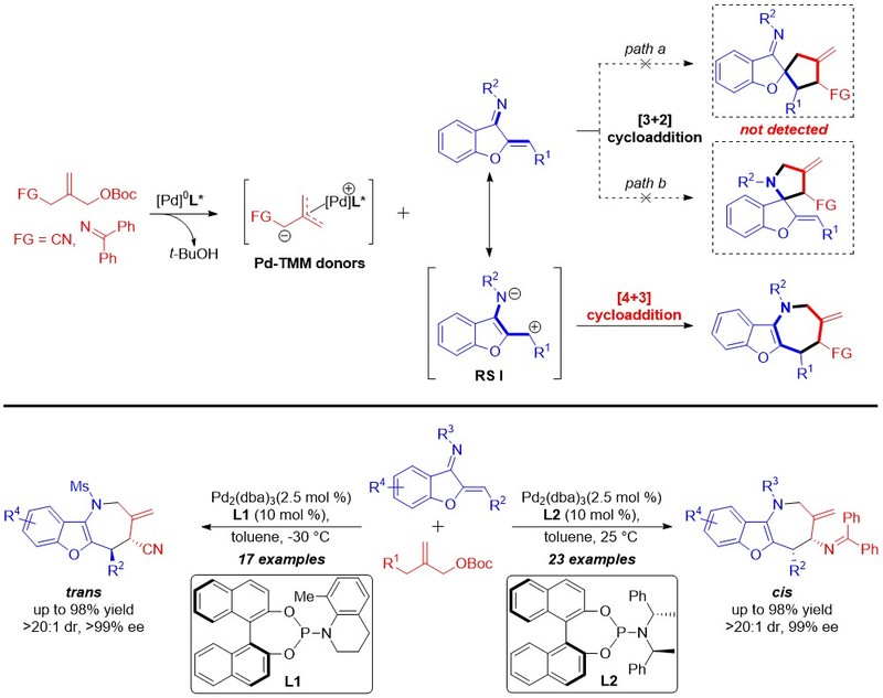 三亞甲基甲烷(TMM)作為一類重要的全碳1,3-偶極子,被廣泛用于多種五元環(huán)類化合物及天然產(chǎn)物的合成中。然而相較于已經(jīng)發(fā)展的非常成熟的TMM參與的[3+2]環(huán)加成反應(yīng),其參與的不對稱[4+3]環(huán)加成反應(yīng)則未見報(bào)道,主要原因在于該反應(yīng)過程中存在區(qū)域選擇性及立體選擇性調(diào)控的難題。為了解決這一科學(xué)難題,鄧衛(wèi)平教授團(tuán)隊(duì)以橙酮亞胺作為四元氮雜雙烯,巧妙地實(shí)現(xiàn)了鈀催化TMM的不對稱[4+3]環(huán)加成反應(yīng),并且成功抑制了潛在的[3+2]環(huán)加成反應(yīng)過程,實(shí)現(xiàn)了高度專一的區(qū)域選擇性調(diào)控,該反應(yīng)以優(yōu)秀的收率(84%-98%)、優(yōu)秀的非對映及對映選擇性(9:1- >20:1 dr, 94%- >99% ee)合成了一系列結(jié)構(gòu)多樣的手性氮雜卓類化合物。值得注意的是,亞氨基和氰基取代的TMM底物,分別專一的得到了cis和trans構(gòu)型的環(huán)加成產(chǎn)物,從而實(shí)現(xiàn)了立體多樣性合成。上述工作拓展了催化不對稱[4+3]環(huán)加成反應(yīng)的類型,為手性氮雜卓類化合物的高效合成提供了新的思路,從而為創(chuàng)新藥物研發(fā)提供了重要的分子實(shí)體。