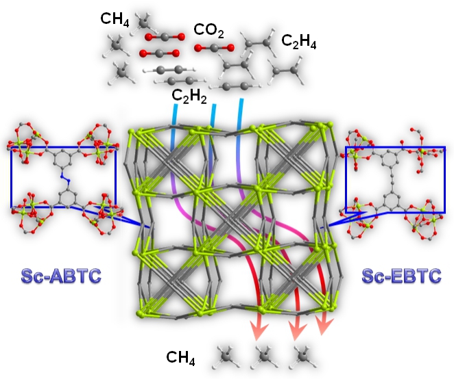 近日,商丘師范學(xué)院化學(xué)化工學(xué)院青年教師張建偉博士在三核簇基Sc-MOF材料的合成和應(yīng)用方面取得重要進(jìn)展,研究成果以第一作者、第一單位在Inorganic Chemistry發(fā)表。作者巧妙的運(yùn)用拓?fù)鋵W(xué)和配體替代策略,成功構(gòu)筑了兩例三核簇基Sc-soc-MOFs,調(diào)控了MOF結(jié)構(gòu)中的金屬中心和孔環(huán)境,從而提高了C2H2的存儲能力和CH4的高效純化性能。該成果的研究思路對其他高性能的Sc-MOF材料的設(shè)計(jì)合成具有重要指導(dǎo)意義。