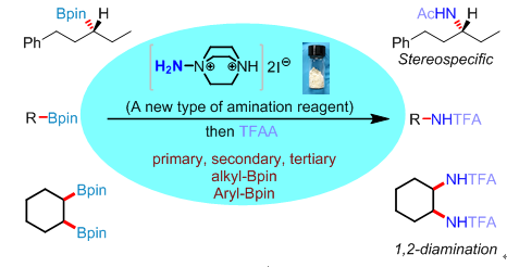 最近,他們團隊與浙江工業(yè)大學的靳立群教授合作成功發(fā)展了以DABCO的氨基季銨鹽(H2N-DABCO)作為新型胺化試劑并首次將該胺化試劑用于有機頻哪醇硼酸酯的胺化反應中(下圖)。產率最高可達96%,且反應具有立體專一性、廣譜的官能團兼容性等。