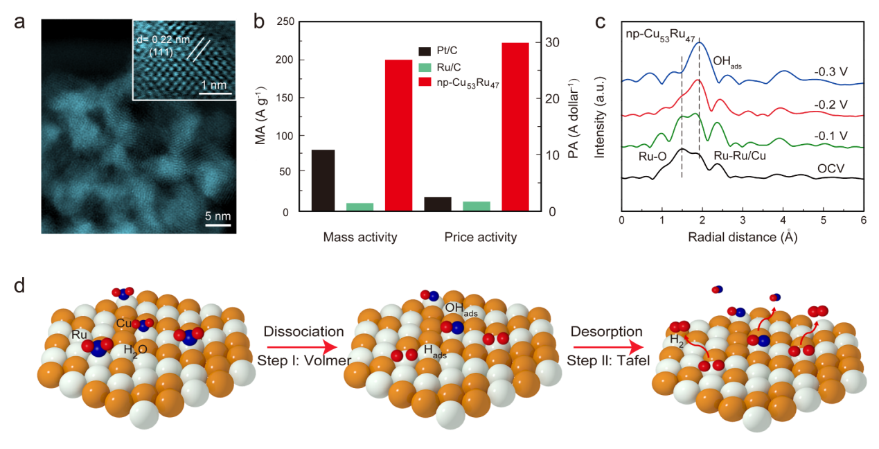 為此,譚勇文教授團隊通過傳統(tǒng)冶金技術(shù)結(jié)合脫合金工藝,制備出不同比例的三維納米多孔Cu-Ru合金。得益于多孔合金的高比表面積以及合金原子的協(xié)同作用,作為堿性電催化析氫催化劑,Ru-Cu合金(np-Cu53Ru47)表現(xiàn)出比商用Pt/C催化劑更高的活性和耐久性。團隊進一步采用原位同步輻射表征和理論模擬計算等手段對納米多孔銅釕合金在真實催化條件下進行系統(tǒng)的研究,發(fā)現(xiàn)釕原子摻入銅基體中,調(diào)制了合金的電子結(jié)構(gòu),不僅加快了水分子吸附和活化的反應(yīng)步驟,還優(yōu)化銅位點及釕位點對氫中間體的吸附-解吸能壘。這項工作不僅成功地合成了雙金屬合金并系統(tǒng)的研究其催化活性來源,而且為實現(xiàn)廉價而有效的能量轉(zhuǎn)換系統(tǒng)開辟了道路。