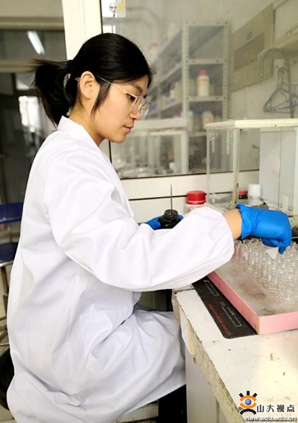 冬日的早晨寒風(fēng)陣陣,明媚的陽光灑在校園里,照在每一個勤奮刻苦的山大學(xué)子身上。在山東大學(xué)化學(xué)新樓的實驗室內(nèi),越過琳瑯滿目的實驗器材,記者見到了被評為“學(xué)術(shù)之星”的張閃閃。她穿著白大褂,正專心敲打著鍵盤,像往常一樣準備開始一天的實驗室生活。
