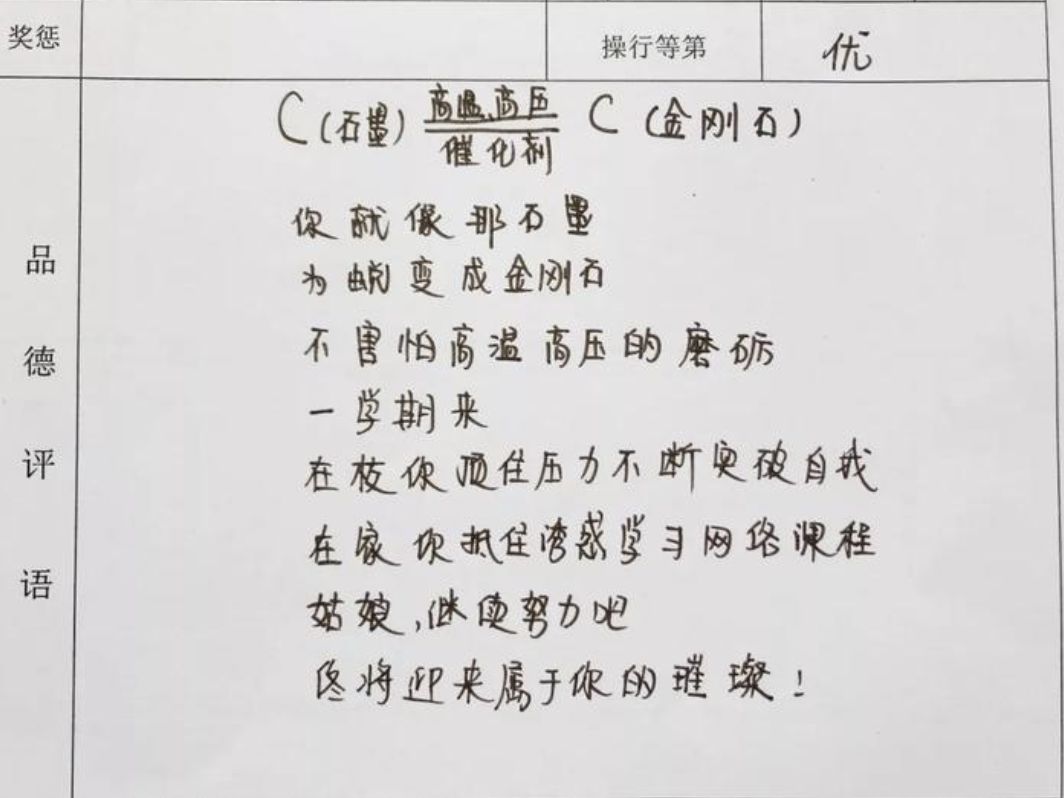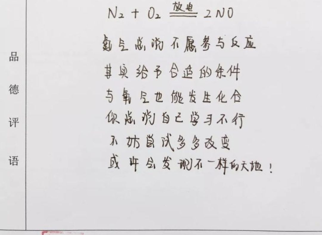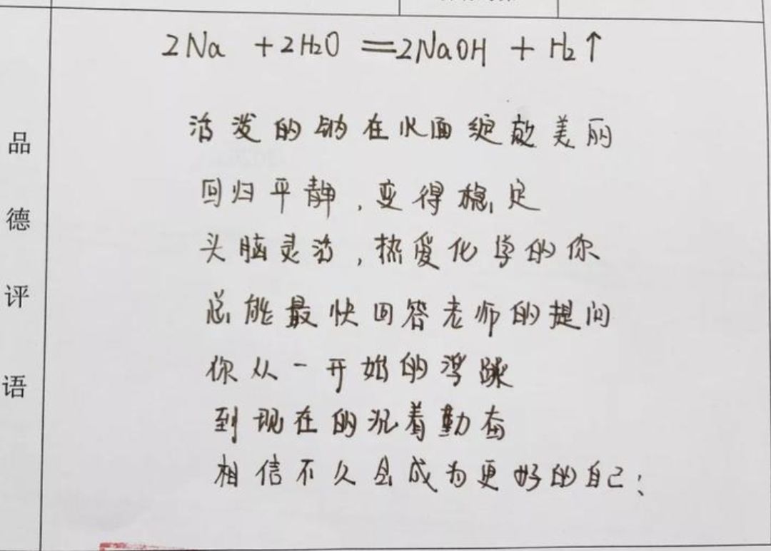 一開始,聽說有老師搞創(chuàng)新,用化學方程式寫評語,記者猜想很有可能是個剛參加工作的新老師。