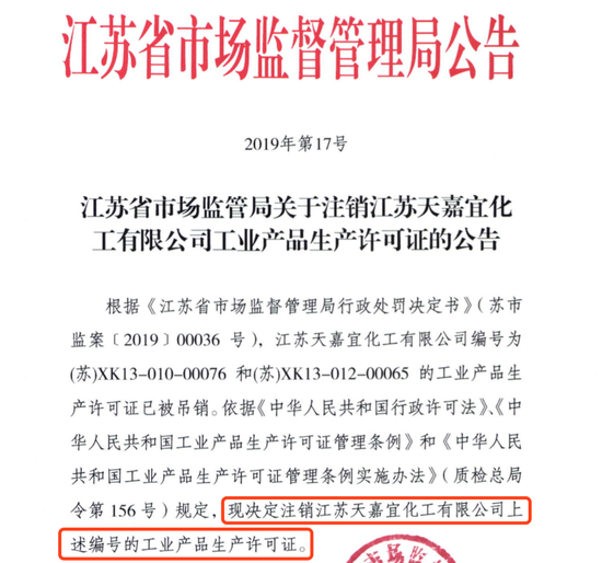 江蘇省市場監(jiān)督管理局下發(fā)的公告文件,天嘉宜化工被吊銷工業(yè)產(chǎn)品生產(chǎn)許可證。 受訪者供圖