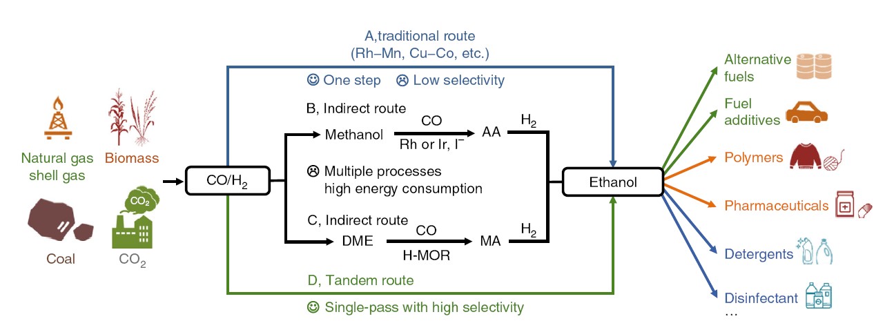 乙醇既可作為替代燃料或優(yōu)質(zhì)汽油添加劑亦是重要基礎化學品,同時也是一種理想的氫載體。乙醇需求量近年增長迅速,我國需求缺口巨大,2020年大約達1200萬噸/年,從煤基合成氣(CO/H2)合成乙醇極具吸引力。當前合成氣合成乙醇有三種方法,其中直接法因在同一催化劑上存在多種反應通道,導致產(chǎn)物選擇性不超過60%。另一方面,多步法路線雖然較為成熟,但因反應和分離/純化步驟多,存在成本貴、能耗高等問題。發(fā)展合成氣直接制乙醇的新方法和新路線具有重大意義。