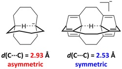 然而,在上述例子中具有對(duì)稱(chēng)氫鍵的結(jié)構(gòu)并不是體系的能量極小點(diǎn)。因此,接下來(lái)他們開(kāi)始著手于利用理論計(jì)算設(shè)計(jì)一些更加合理的對(duì)稱(chēng)C···H···C氫鍵。為了將兩個(gè)碳原子之間的距離固定在2.5 ?附近,作者參考了質(zhì)子化1,6-二氮雜雙環(huán)[4.4.4]十四烷(1;其結(jié)構(gòu)如圖1b所示)中的對(duì)稱(chēng)N···H···N氫鍵。在該結(jié)構(gòu)中,兩個(gè)氮原子之間的距離為2.53 ?。他們?cè)噲D通過(guò)設(shè)計(jì)分子內(nèi)C···H···C氫鍵,并利用環(huán)張力強(qiáng)迫兩個(gè)碳原子靠近(圖3;左)。但是,這一策略并未取得成功。經(jīng)過(guò)幾何優(yōu)化,作者發(fā)現(xiàn)體系能量極小點(diǎn)中的C?H···C氫鍵是非對(duì)稱(chēng)的,且兩個(gè)碳原子之間的距離長(zhǎng)達(dá)2.93 ?。為了進(jìn)一步縮短兩個(gè)碳原子之間的距離,作者通過(guò)引入籠狀結(jié)構(gòu)(例如桶烯)進(jìn)一步增加了體系的環(huán)張力。如圖3(右)所示,此時(shí)體系能量極小點(diǎn)中兩個(gè)碳原子之間的距離僅為2.53 ?,且C···H···C氫鍵是對(duì)稱(chēng)的。至此,作者成功例證了對(duì)稱(chēng)C···H···C氫鍵存在的可能性。