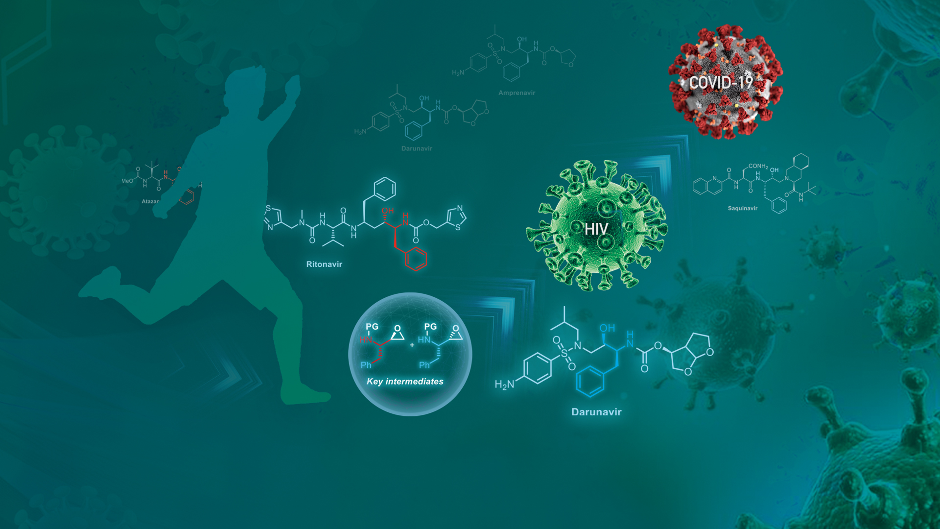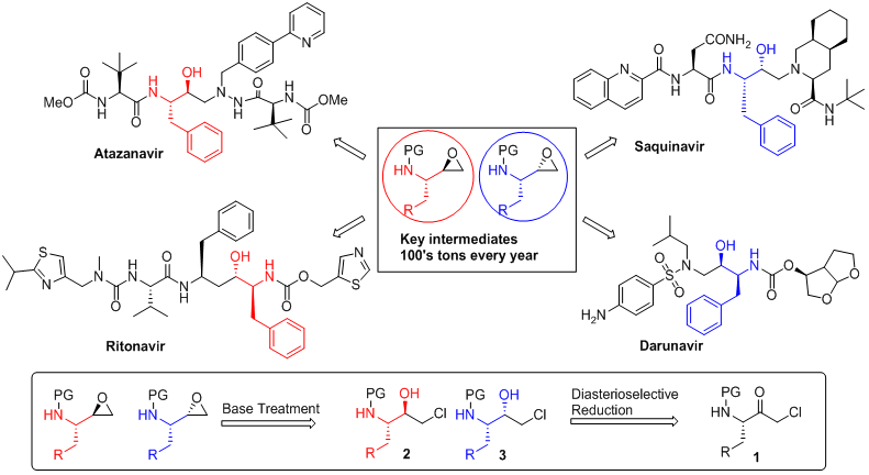 該研究主要通過銠催化的不對稱轉(zhuǎn)移氫化非對映選擇性地構(gòu)筑兩種氨基氯代醇2和3(上圖),然后經(jīng)過簡單的堿處理過程可得到關(guān)鍵的氨基環(huán)氧中間體。與此前一些還原策略相比較,該合成方法極大地提高了合成效率和非對映選擇性(轉(zhuǎn)化數(shù)TON高達4900,非對映選擇性高達99:1)。從這兩個關(guān)鍵中間體出發(fā)可以合成一系列的抗HIV蛋白酶抑制劑類藥物,例如阿扎那韋(Atazanavir)、沙奎那韋(Saquinavir)、利托那韋(Ritonavir)和達蘆那韋(Darunavir)等。