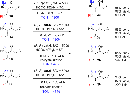 在研究初期,該研究團隊先對近年來發(fā)展的一系列轉(zhuǎn)移氫化催化劑進行了系統(tǒng)篩選,最終發(fā)現(xiàn)催化劑(R,R)-cat 6和(S,S)-cat 6表現(xiàn)出最優(yōu)異的活性和非對映選擇性,能夠以大于99:1的選擇性分別得到兩種不同的氨基氯代醇2和3。通過對反應(yīng)條件的進一步篩選和優(yōu)化,發(fā)現(xiàn)當(dāng)采用二氯甲烷(DCM)作溶劑時,能夠得到最優(yōu)的反應(yīng)活性和選擇性。