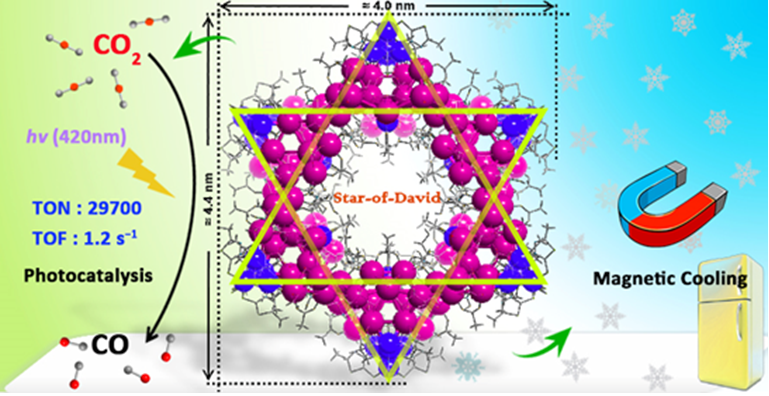 近日,在鄭彥臻教授指導(dǎo)下,西安交通大學(xué)前沿院博士后陳偉鵬采用“混合配體”策略,在溶劑熱條件下成功制備出一例高核過渡-稀土混金屬納米團簇—{Ni36Gd102}。該團簇分子擁有六芒星狀的形狀,為目前報道的第二大3d-4f混金屬團簇,并具有良好的溶液穩(wěn)定性。因團簇金屬鎳離子存在潛在的空余配位點,因此該化合物可以選擇性地在可見光下催化還原CO2為CO(90.2%),其TON為29700、轉(zhuǎn)換頻率為1.2 s?1,超過了多數(shù)同類型的催化劑。而該團簇含有的大量稀土釓元素也使得該分子材料在2K 和ΔH= 7 T時產(chǎn)生了41.3 J·kg–1·K–1的磁熵變,在低溫磁制冷方面具有較好的應(yīng)用潛力。與此同時,他們利用周期性密度泛函理論及循環(huán)伏安法對催化機理予以解釋。該工作不僅為3d-4f混金屬團簇的設(shè)計合成提供了新的思路,同時也將為稀土基納米團簇的溶液穩(wěn)定性、催化性能的探究及功能拓展提供了借鑒與理論依據(jù)。