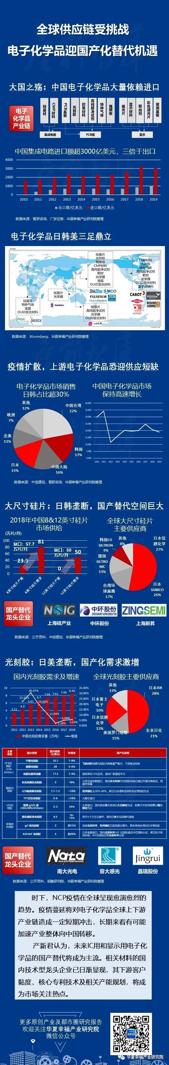復盤2011年日本大地震,占據(jù)全球電子化學品過半市場份額的日本陷入停工停產(chǎn),國內(nèi)眾多的材料廠商借勢實現(xiàn)了對日本供應商的部分產(chǎn)品替代。以史為鑒,此次NCP疫情的爆發(fā)無疑將加速中高端電子化學品國產(chǎn)替代進程。伴隨國內(nèi)企業(yè)陸續(xù)復工,日韓若后續(xù)出現(xiàn)大面積停工減產(chǎn)或運輸受阻,全球供應鏈面臨斷裂風險,國內(nèi)電子化學品供應商將借機搶占全球市場,迎來國產(chǎn)替代的黃金窗口期。
