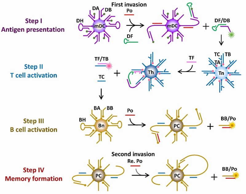 研究發(fā)現(xiàn),在利用一段HIV病毒基因序列模擬病毒侵入過程中,當(dāng)HIV序列不存在時(shí),該系統(tǒng)中三種DNA分子機(jī)器均處于穩(wěn)定的初始狀態(tài)。當(dāng)HIV序列首次入侵后,機(jī)器DC由未成熟狀態(tài)變?yōu)槌墒鞝顟B(tài),將抗原呈遞給機(jī)器T,使其由初始態(tài)轉(zhuǎn)變?yōu)檩o助T細(xì)胞狀態(tài),進(jìn)而激活機(jī)器B釋放模擬抗體鏈與病原體結(jié)合,模擬免疫系統(tǒng)首次應(yīng)答過程。當(dāng)病原體再次入侵上述系統(tǒng),無需機(jī)器DC和機(jī)器T參與,第一次應(yīng)答過程中由機(jī)器B轉(zhuǎn)變成的機(jī)器PC可直接釋放抗體鏈與病原體結(jié)合,該過程比初次應(yīng)答反應(yīng)更高效,進(jìn)而模擬了免疫系統(tǒng)的記憶功能及二次應(yīng)答。模塊化設(shè)計(jì)可將該網(wǎng)絡(luò)交互系統(tǒng)進(jìn)一步升級(jí),響應(yīng)于不同的分子,如腫瘤標(biāo)志物miRNA或蛋白、釋放小干擾RNA、反義寡核苷酸或miRNA抑制劑等,有望拓展開發(fā)感知細(xì)胞內(nèi)多種刺激物的智能靶向診療系統(tǒng)。英國(guó)皇家化學(xué)會(huì)Chemistry World對(duì)此工作進(jìn)行了詳細(xì)評(píng)述(https://www.chemistryworld.com/news/first-three-component-artificial-immune-system-made-of-dna-studded-gold-nanomachines/4011282.article)。