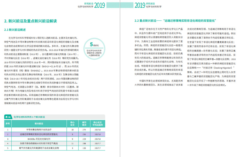 近日,中科院科技戰(zhàn)略咨詢研究院、中科院文獻情報中心與科睿唯安聯(lián)合向全球發(fā)布了《2019研究前沿》報告和《2019研究前沿熱度指數(shù)》報告。該報告反映相關學科發(fā)展趨勢,并評估世界主要國家在十個大學科領域100個熱點前沿和37個新興前沿的研究活躍程度。其中,蘇州大學材料與化學化工學部朱晨教授團隊所從事的研究領域“遠端遷移策略實現(xiàn)非活化烯烴的雙官能化”入選為化學與材料科學5個重點新興前沿領域之一,并是首次出現(xiàn)的兩個全新研究方向之一。報告中描述: