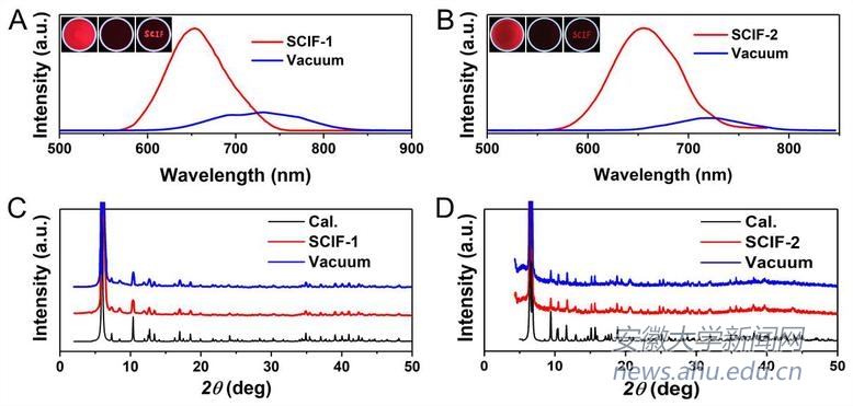 組裝后形成的SCIF-1和SCIF-2框架材料具有熒光性能,其熒光量子產(chǎn)率分別為6.73%和5.49%。該材料對相對小尺寸的質(zhì)子性溶劑具有特征的開關響應性。在真空去溶劑化之后,材料的熒光性能大大減弱,而對材料進行小尺寸質(zhì)子性溶劑處理之后,材料的熒光性能則可以完全恢復,而其它非質(zhì)子性溶劑及大尺寸質(zhì)子性溶劑則不能顯示出熒光恢復的現(xiàn)象。結(jié)合上述實驗現(xiàn)象,我們推測這一質(zhì)子性溶劑開關響應性能可能是由于質(zhì)子性溶劑與框架孔道中SbF6-上的F原子之間形成了氫鍵,削弱了材料中連接體和配體的振動,從而增強了輻射躍遷過程,使得熒光得以呈現(xiàn)和恢復。