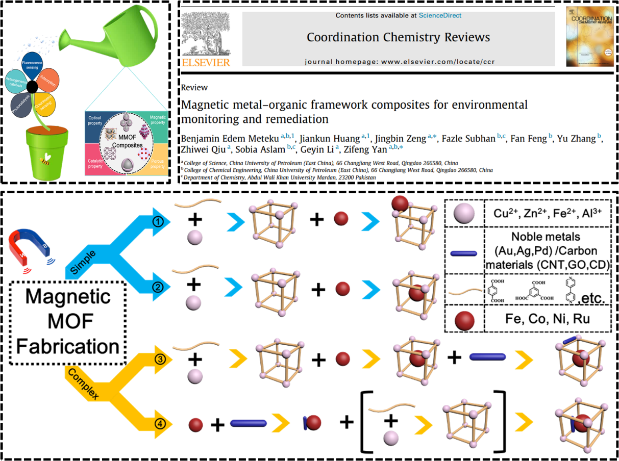 題目為《用于環(huán)境監(jiān)測(cè)與修復(fù)的磁性金屬-有機(jī)骨架復(fù)合材料》(Magnetic metal-organic framework composites for environmental monitoring and remediation)的綜述論文發(fā)表在化學(xué)領(lǐng)域權(quán)威期刊Coordination Chemistry Reviews (DOI information:10.1016/j.ccr.2020.213261)。博士生本杰明(Benjamin Edem Meteku)、黃劍坤為該論文第一作者。曾景斌副教授、閻子峰教授為共同通訊作者。中國(guó)石油大學(xué)(華東)為第一署名單位,該項(xiàng)工作得到國(guó)家重點(diǎn)研發(fā)計(jì)劃政府間國(guó)際科技創(chuàng)新合作重點(diǎn)專項(xiàng)和山東省重點(diǎn)研發(fā)計(jì)劃項(xiàng)目資助。