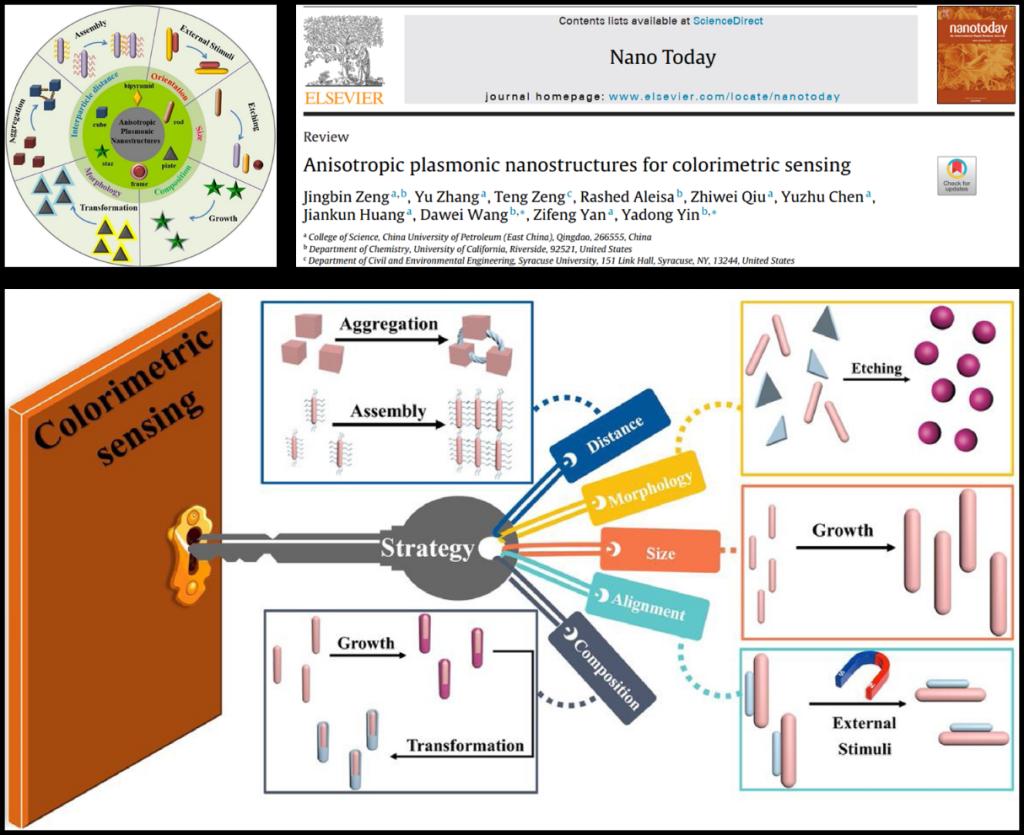 題目為《用于比色傳感的各向異性等離子體納米結(jié)構(gòu)》(Anisotropic plasmonic nanostructures for colorimetric sensing)的綜述論文發(fā)表在材料領(lǐng)域權(quán)威期刊Nano Today (DOI information:10.1016/j.nantod.2020.100855)。曾景斌副教授為該論文第一作者,加州大學(xué)河濱分校殷亞?wèn)|教授、王大偉研究員為共同通訊作者。中國(guó)石油大學(xué)(華東)為第一署名單位。該項(xiàng)工作得到國(guó)家自然科學(xué)基金和中央高?;究蒲袠I(yè)務(wù)費(fèi)資助。