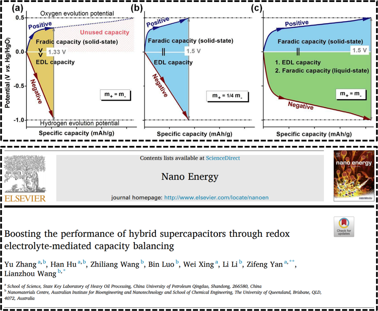 題目為《混合超級(jí)電容器中不對(duì)稱電解質(zhì)概念設(shè)計(jì)助力比容量提升》(Boosting the performance of hybrid supercapacitors through redox electrolyte-mediated capacity balancing)的研究論文發(fā)表在材料領(lǐng)域頂級(jí)期刊Nano Energy (DOI information:10.1016/j.nanoen.2019.104226)。博士生張譽(yù)為該論文第一作者。我校閻子峰教授和澳大利亞昆士蘭大學(xué)王連洲教授為共同通訊作者。中國(guó)石油大學(xué)(華東)為第一署名單位,該項(xiàng)國(guó)際合作研究成果得到國(guó)家創(chuàng)新型人才國(guó)際合作培養(yǎng)項(xiàng)目資助。