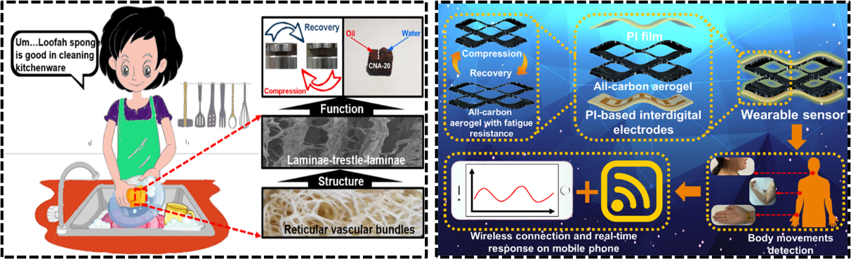 題目為《仿生構(gòu)筑具有高度有序的層-棧橋-層狀結(jié)構(gòu)的銅基海綿》(Biomimetic Fabrication of Highly Ordered Laminae-trestle-laminae Structured Copper Aero-sponge)和《高彈性耐疲勞多拱結(jié)構(gòu)全碳?xì)饽z基可穿戴傳感器》(Multi-arches Structured All-carbon Aerogels with Super Elasticity and High Fatigue Resistance as Wearable Sensors)的研究論文分別發(fā)表在材料領(lǐng)域知名期刊ACS Applied Materials & Interfaces(DOI information: 10.1021/acsami.0c01794)和Nanoscale(DOI information: 10.1039/C9NR10593J)。博士生黃劍坤為兩篇論文第一作者,曾景斌副教授、閻子峰教授為共同通訊作者。中國(guó)石油大學(xué)(華東)為第一署名單位。該項(xiàng)工作得到國(guó)家重點(diǎn)研發(fā)計(jì)劃專項(xiàng)、山東省重點(diǎn)研發(fā)計(jì)劃以及研究生創(chuàng)新工程項(xiàng)目資助。上述工作通過(guò)利用取向性孔道結(jié)構(gòu)賦予三維宏觀組裝體輕質(zhì)高強(qiáng)的優(yōu)勢(shì),提供了一種冰晶生長(zhǎng)誘導(dǎo)的結(jié)構(gòu)組裝技術(shù),以常見的一維金屬納米線、二維還原氧化石墨烯為組裝單元,跨尺度構(gòu)筑具有優(yōu)異力學(xué)性能的三維宏觀組裝體。這種組裝技術(shù)可應(yīng)用于多種取向性微納結(jié)構(gòu)的創(chuàng)制,為進(jìn)一步提高宏觀組裝體的功能化提供了一種可靠方法。