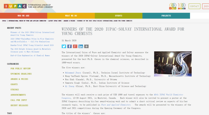 IUPAC成立于1919年,被公認(rèn)為世界上最大、最具權(quán)威性的化學(xué)組織,致力于推動(dòng)解決化學(xué)科學(xué)的世界問題,促進(jìn)化學(xué)更好地服務(wù)于人類的發(fā)展。自2000年開始設(shè)立國際青年化學(xué)家獎(jiǎng),每年評選一次,旨在對上一年度全世界范圍內(nèi)最優(yōu)秀的化學(xué)博士學(xué)位論文進(jìn)行獎(jiǎng)勵(lì),以鼓勵(lì)這些正處事業(yè)起步階段的優(yōu)秀青年化學(xué)家。每年全球僅有4~5名正式獲獎(jiǎng)?wù)?,另?~6人獲得提名獎(jiǎng)。