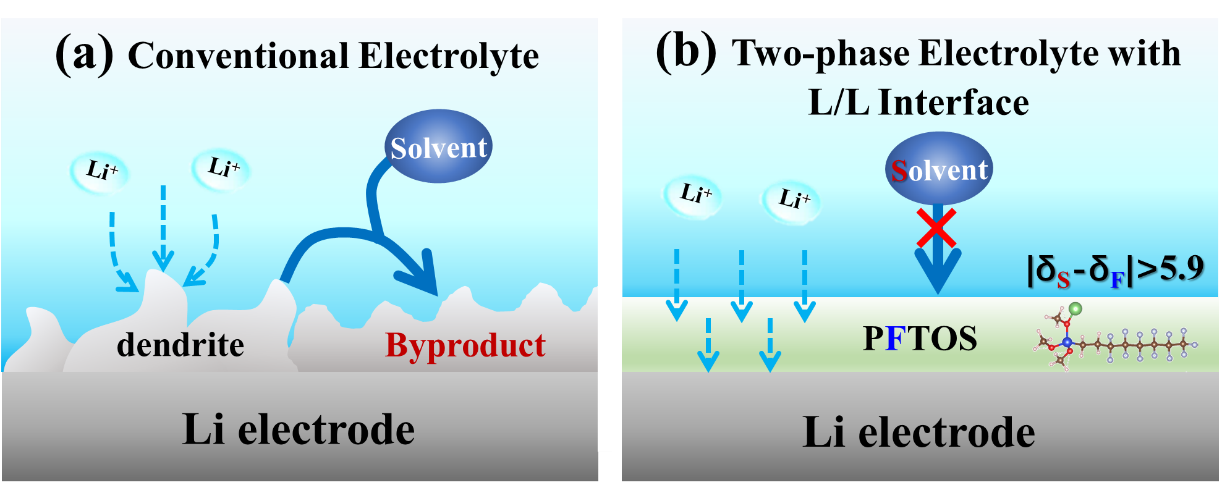 圖 (a):傳統(tǒng)電解液體系中鋰電極的腐蝕和枝晶生長(zhǎng);(b):液/液界面兩相電解液體系抑制鋰電極的腐蝕和枝晶生長(zhǎng),增強(qiáng)鋰電極的穩(wěn)定性。