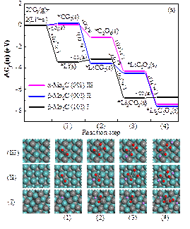 湖南大學(xué)材料科學(xué)與工程學(xué)院郭坤琨、袁定旺教授與四川省新材料研究中心王斌、程建麗研究員合作,利用第一性原理密度泛函理論(DFT)計(jì)算,首次研究了碳化鉬(Mo2C)作為Li-CO2電池陰極催化劑的反應(yīng)機(jī)理。根據(jù)前人的實(shí)驗(yàn)研究,設(shè)計(jì)了5條不同的反應(yīng)路徑,計(jì)算不同中間產(chǎn)物的吉布斯自由能變化,從中選擇了在三個(gè)碳化鉬(Mo2C)晶面的最優(yōu)反應(yīng)路徑,見圖1。系統(tǒng)研究了草酸鋰(Li2C2O4)和碳酸鋰(Li2CO3)成核過程中不同中間產(chǎn)物的吉布斯自由能變化,見圖2。理論結(jié)果也進(jìn)一步表明三個(gè)碳化鉬(Mo2C)晶面均抑制了草酸鋰(Li2C2O4)分解形成碳酸鋰(Li2CO3)的化學(xué)反應(yīng)。因此,這些研究從理論上證明了Li2C2O4可以作為最終放電產(chǎn)物被穩(wěn)定下來,從而阻止進(jìn)一步形成Li2CO3。利用Bader電荷分析研究了吸附在催化表面上的Li2C2O4的表面電荷分布,發(fā)現(xiàn)在Li2C2O4和Mo2C表面之間存在電子轉(zhuǎn)移。這些研究將促進(jìn)對(duì)Li-CO2電池中電化學(xué)過程的理解和認(rèn)識(shí),也為Li-CO2電池陰極催化劑的設(shè)計(jì)和優(yōu)化提供直接的理論指導(dǎo)。