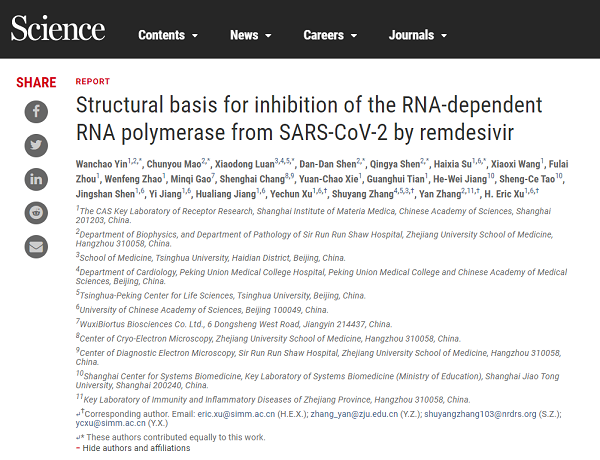 中國科學院上海藥物研究所徐華強課題組博士后尹萬超為論文第一作者,浙江大學博士后毛春友、研究助理沈丹丹和博士后沈慶亞,清華大學醫(yī)學院博士生欒曉東以及上海藥物研究所博士生蘇海霞為論文的共同第一作者,中國科學院上海藥物研究所徐華強研究員、浙江大學張巖教授、北京協(xié)和醫(yī)院張抒揚教授和上海藥物研究所許葉春研究員為共同通訊作者。中國科學院上海藥物研究所為第一完成單位。此項工作獲得了浙江大學電鏡中心和上海藥物所電鏡中心的大力支持。中科院上海藥物所蔣華良和沈敬山課題組在瑞德西韋三磷酸活性成分合成方面給予及時、重要的關鍵貢獻。