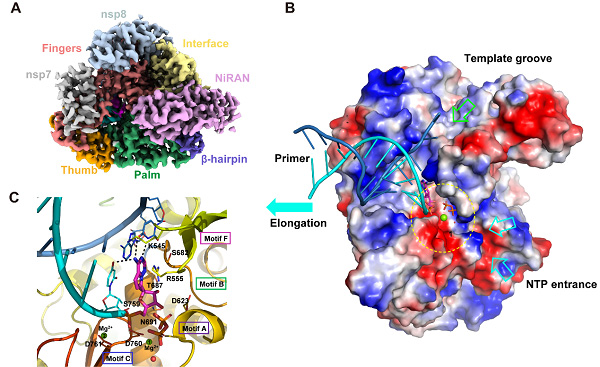 新冠肺炎病毒的RNA復制酶結合RNA和抑制劑瑞德西韋復合物的冷凍電鏡結構。(A),復合物結構的冷凍電鏡電子密度圖;(B)復合物結構活性部位的表面視圖;(C)RNA復制酶活性位點的近距離視圖,顯示了與瑞德西韋相互作用的關鍵殘基和堿基。