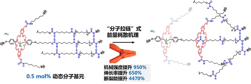 研究者們創(chuàng)新性地將擬輪烷交聯(lián)劑引入具有豐富的氫鍵堆積域的聚氨酯網(wǎng)絡(luò),得到兼具主客體相互作用和氫鍵作用的超分子聚合物網(wǎng)絡(luò)。利用極少量(0.5 mol%)的擬輪烷交聯(lián)劑就可以使聚氨酯的機(jī)械強(qiáng)度提高950%,伸長率提高650%,斷裂能提升4470%。研究人員進(jìn)一步通過傅里葉變換紅外光譜和X射線衍射等技術(shù)證明了機(jī)械作用下的氫鍵斷裂,并由此證明這種機(jī)械增強(qiáng)是由于滑環(huán)效應(yīng)與氫鍵堆積網(wǎng)絡(luò)的協(xié)同作用,使得氫鍵堆積域被分子拉鏈?zhǔn)降幕瑒油狡茐牡哪芰亢纳C(jī)制得以實(shí)現(xiàn)。這項(xiàng)工作為高性能彈性體的構(gòu)建提供了新策略,同時推動了人工分子機(jī)器在無溶劑型聚合網(wǎng)絡(luò)中的實(shí)際應(yīng)用。