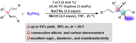 東北師范大學(xué)熊濤、張前教授發(fā)展了一種高效的雙烯基硅烷的不對(duì)稱硼氫化反應(yīng),去對(duì)稱化地連續(xù)構(gòu)建了手性硅、手性碳立體中心,同時(shí)向分子中引入重要的硼基團(tuán)。該反應(yīng)不僅有效克服了去對(duì)稱化過程中存在的化學(xué)、區(qū)域、非對(duì)映以及對(duì)映選擇性難以同時(shí)調(diào)控的問題,還在高活性親核試劑存在下避免了已構(gòu)建的硅立體中心可能的消旋化,實(shí)現(xiàn)了雙苯乙烯基硅烷與聯(lián)硼酸頻哪醇酯(B2pin2)的去對(duì)稱化硼氫化反應(yīng),以高的化學(xué)、區(qū)域、對(duì)映及非對(duì)映選擇性合成了一系列多手性中心的含硼有機(jī)硅烷。