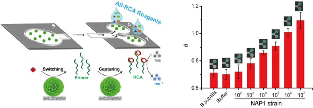 在此基礎上,發(fā)展了一種簡便的微流控紙分析器件,實現(xiàn)了糞便樣品中艱難梭菌的可視化檢測,與商業(yè)化的檢測試劑盒相比,該器件在較短的時間內(nèi)可以達到更高的靈敏度。對于流行菌株NAP1,該器件在30分鐘內(nèi)可以檢測到104個細菌。