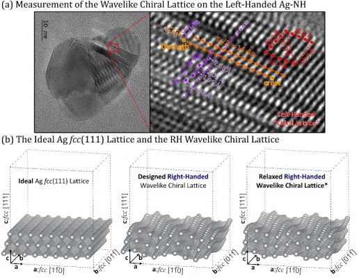 圖1. 左手性銀納米螺旋的HRTEM圖片分析與測量;右手性銀螺旋顆粒表面理論模型的設(shè)計(jì)構(gòu)建與優(yōu)化