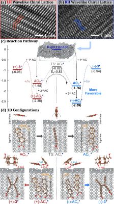 從實(shí)驗(yàn)里觀察到的這種基板旋轉(zhuǎn)最終導(dǎo)致分子手性選擇性合成現(xiàn)象,是如何一步一步從宏觀傳遞到微觀的呢?通過密度泛函(DFT)理論計(jì)算,王陽剛與課題組博士后夏廣杰發(fā)現(xiàn),金屬納米螺旋上的“波浪型手性點(diǎn)陣”(Wavelike Chiral Lattice)在手性從宏觀到微觀的傳遞中起著至關(guān)重要的作用。在宏觀中基板的旋轉(zhuǎn)下,由于GLAD中的剪切力作用,在其產(chǎn)生的金屬納米螺旋的HRTEM圖像中可以看到一些具有手性的褶皺區(qū)域。這些手性褶皺區(qū)域的產(chǎn)生并不難以理解:生活中做油條或者麻花時,面團(tuán)的過度旋轉(zhuǎn)扭曲就會產(chǎn)生類似的褶皺。而這些手性褶皺區(qū)域放大后即是“波浪型手性點(diǎn)陣”。不同于一般研究的金屬表面,這些“波浪型手性點(diǎn)陣”并不是一個平面,而是具有周期性的原子起伏。經(jīng)過對含有手性的納米螺旋HRTEM圖片的分析與測量,可以設(shè)計(jì)出這些“波浪型手性點(diǎn)陣”的表面模型,經(jīng)過優(yōu)化后便可進(jìn)一步地進(jìn)行AC吸附與二聚反應(yīng)的計(jì)算(見圖1)。