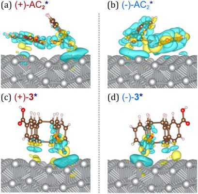 圖3.手性AC二聚體在吸附時與右手性銀納米螺旋表面的電子相互作用