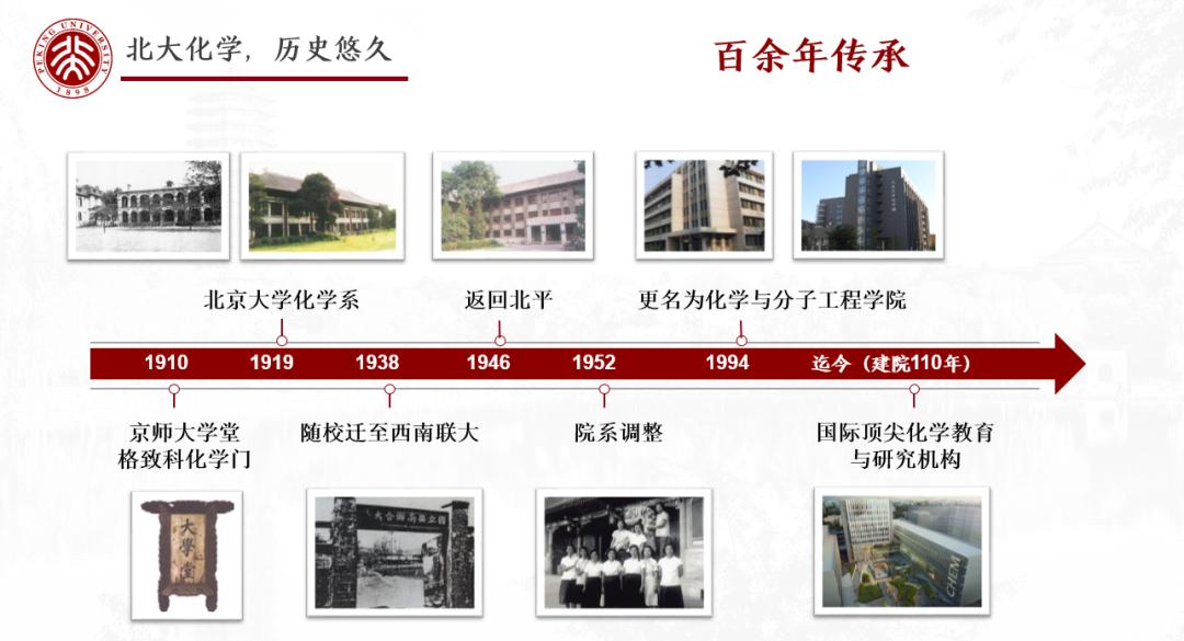 北京大學(xué)化學(xué)學(xué)科肇始于1910年成立的京師大學(xué)堂格致科化學(xué)門,是中國國立大學(xué)中最早設(shè)立的化學(xué)系,1952年院系調(diào)整時由北京大學(xué)、清華大學(xué)、燕京大學(xué)三?;瘜W(xué)系合并重組而成,1994年更名為化學(xué)與分子工程學(xué)院,簡稱化學(xué)學(xué)院。