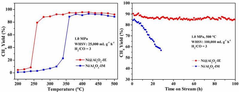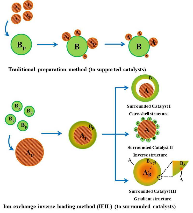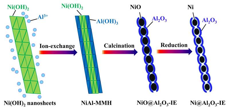 負(fù)載型催化劑在多相催化過程中被廣泛使用,其中活性相和載體之間的界面相互作用及界面密度對(duì)催化反應(yīng)機(jī)制及催化性能的影響一直以來備受關(guān)注。傳統(tǒng)負(fù)載型催化劑一般通過浸漬法和沉淀法制備,通常只能提供有限的界面密度且界面相互作用較弱,影響其催化活性和使用穩(wěn)定性。針對(duì)這些問題,介觀催化團(tuán)隊(duì)郭學(xué)鋒課題組提出反向設(shè)計(jì)構(gòu)造包圍型催化劑的設(shè)想,并發(fā)展了一種簡易且普適的包圍型催化劑制備方法,即離子交換逆負(fù)載法制備包圍型催化劑。在這個(gè)過程中,活性金屬氫氧化物前體(Ap)投入到載體前體(Bp)的溶液中,在氫氧化物溶度積的差異下發(fā)生離子交換反應(yīng),載體前體的金屬離子取代Ap表面的金屬離子形成混合金屬氫氧化物,隨后經(jīng)焙燒、還原形成具有核殼結(jié)構(gòu)的A@B包圍型催化劑。例如Ap代表Ni(OH)2納米片,用Al3+大量交換Ni2+,最終得到具有核殼結(jié)構(gòu)的Ni@Al2O3-IE包圍型催化劑。調(diào)控不同的離子交換程度及金屬、載體前驅(qū)體的種類,還可得到具有反相結(jié)構(gòu)、梯度結(jié)構(gòu)的包圍型催化劑。相比于傳統(tǒng)負(fù)載型催化劑,包圍型結(jié)構(gòu)具有更高的界面密度和相互改變的界面性質(zhì),并且因?yàn)榛钚韵啾惠d體物理隔離具有高穩(wěn)定性,使其在催化反應(yīng)中表現(xiàn)出更優(yōu)越的催化性能。例如Ni@Al2O3-IE包圍型催化劑,在CO甲烷化反應(yīng)中表現(xiàn)出優(yōu)異的低溫活性及高溫穩(wěn)定性。