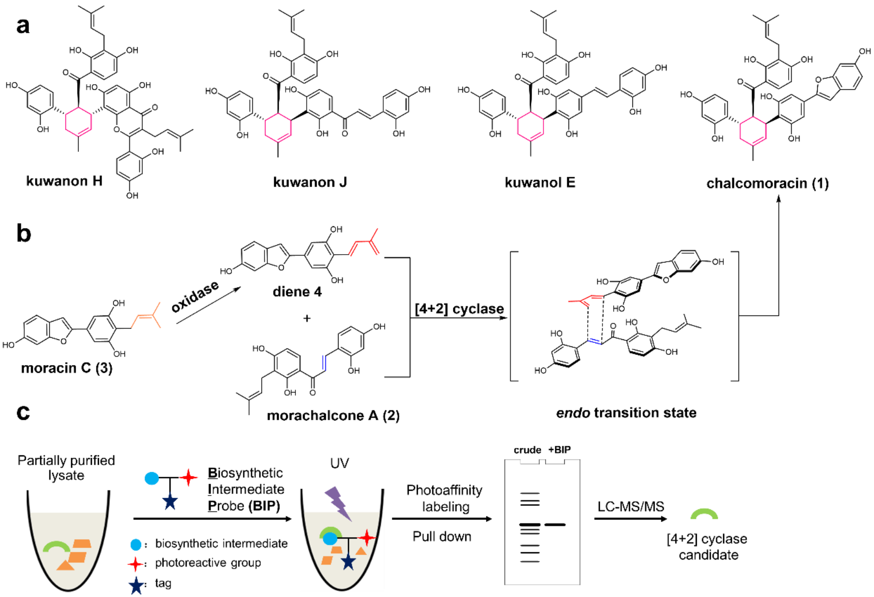 植物天然產(chǎn)物作為內(nèi)源性小分子參與了自身重要生理活動(dòng),例如調(diào)控植物自身的生長(zhǎng)發(fā)育以及抵御病蟲(chóng)害, 同時(shí)也是治療人類(lèi)重大疾病的創(chuàng)新藥物分子的主要來(lái)源。因此,解析植物天然產(chǎn)物的生物合成途徑對(duì)于植物生物學(xué)、生態(tài)學(xué)研究、以及開(kāi)發(fā)創(chuàng)新藥物治療人類(lèi)重大疾病都具有重要意義。然而由于植物自身的特點(diǎn)(生長(zhǎng)緩慢,基因組龐大)以及參與生物合成的基因往往不成簇分布的現(xiàn)象,植物天然生物合成研究方法有限,進(jìn)展緩慢。在本文中,雷曉光課題組開(kāi)發(fā)出一種基于天然生物合成中間體分子探針(Biosynthetic Intermediate Probes, BIPs)的靶標(biāo)垂釣策略(如圖1所示),并與合作者一起通過(guò)結(jié)合植物天然產(chǎn)物生物合成研究中的常規(guī)手段(活性導(dǎo)向蛋白分離以及轉(zhuǎn)錄組測(cè)序等方法),成功在桑樹(shù)愈傷組織中鑒定出兩個(gè)FAD依賴(lài)蛋白(MaMO和MaDA),其中MaDA被進(jìn)一步證明為自然界中存在的首個(gè)催化分子間Diels-Alder反應(yīng)的單功能酶。該基于“天然產(chǎn)物生物合成中間體分子探針”的化學(xué)生物學(xué)研究策略,為解析植物天然產(chǎn)物生物合成途徑提供了新的研究思路。