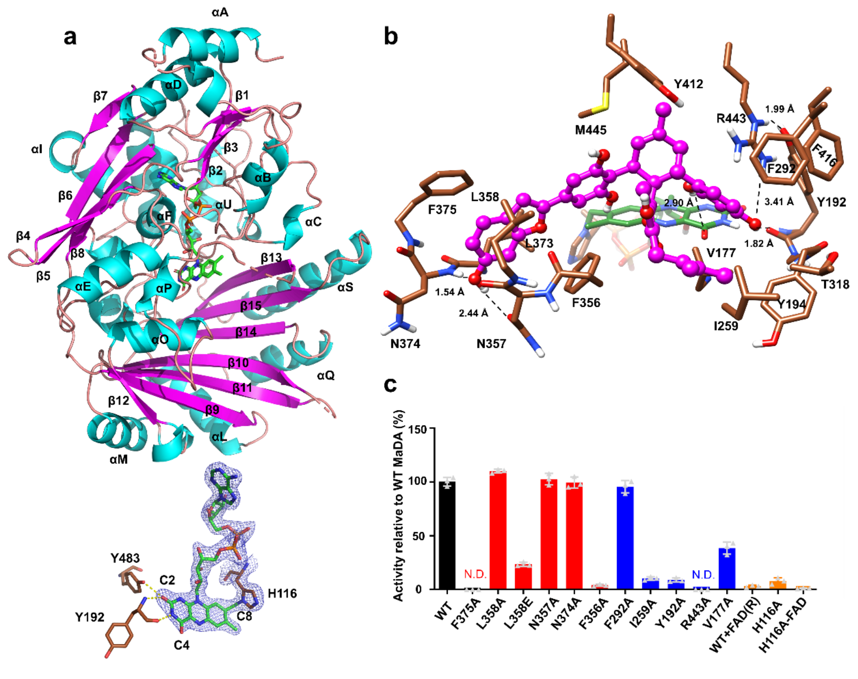 圖2:基于MaDA晶體結(jié)構(gòu)的分子對(duì)接以及點(diǎn)突變實(shí)驗(yàn)揭示了MaDA與底物形成相互作用的關(guān)鍵位點(diǎn)